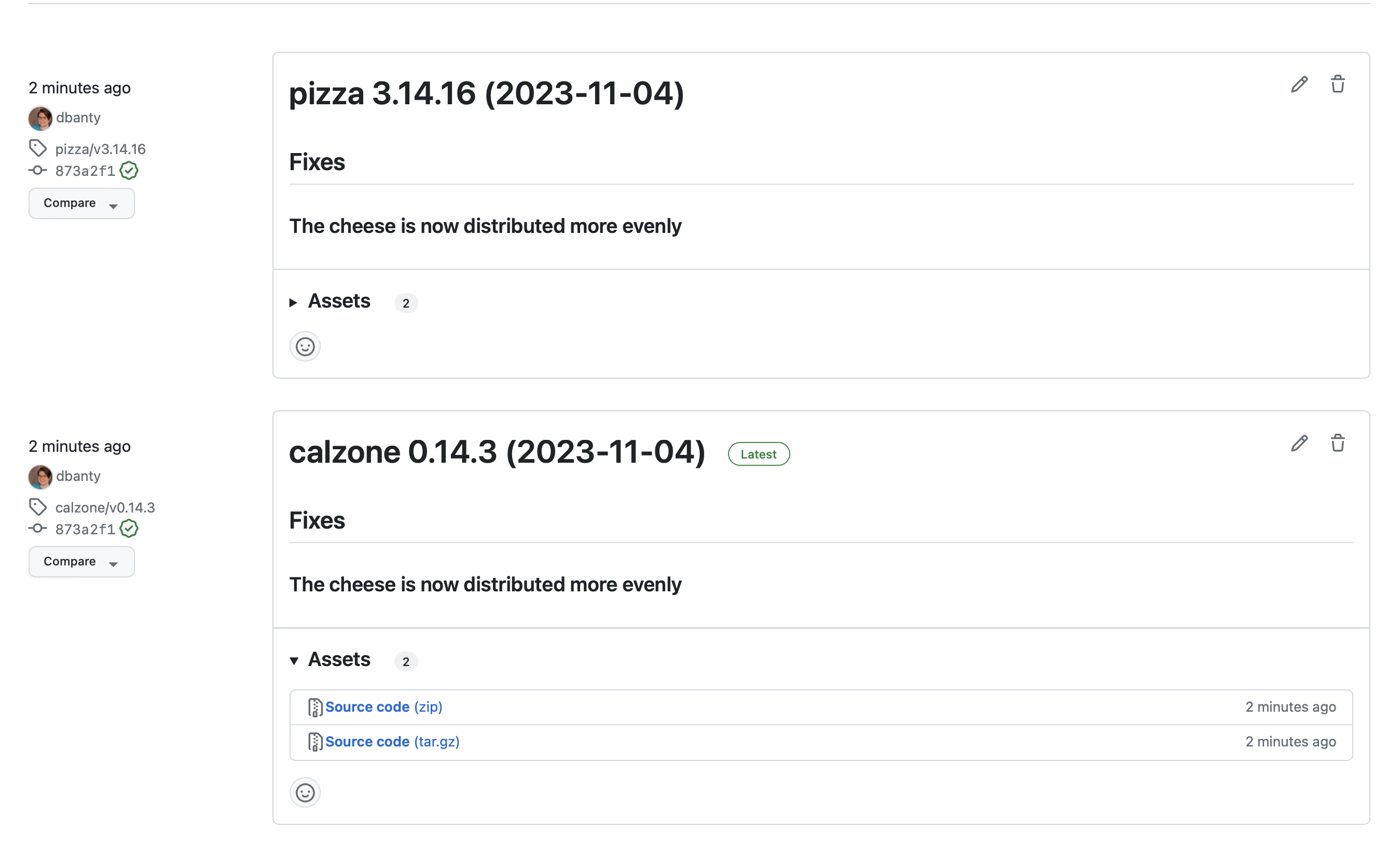 Knope creates one release on GitHub per package so that it’s easy for consumers to see what’s changed in only the packages they care about!